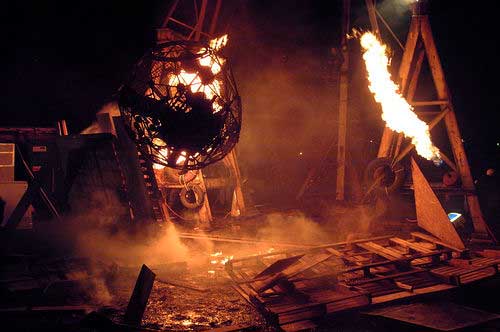 Come ride the wrecking ball! Madagascar built this four-ton ride on site at the Robodock festival. Riders climbed inside an ornate steel-mesh ball, were towed back between two 30-foot towers, and smashed everything in their way.