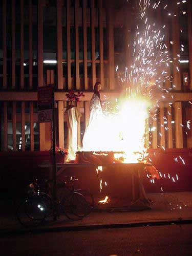 Madagascar hijacked a small art parade with its own larger, louder procession, led by bishops carrying a mock saint mounted atop a giglio platform. Hundreds of people blocked streets on the Lower East Side when police responded. After a short chase, the police turned the other way and the bishops lit the platform, which exploded with fireworks and burst into flames. With the Hungry March Band.